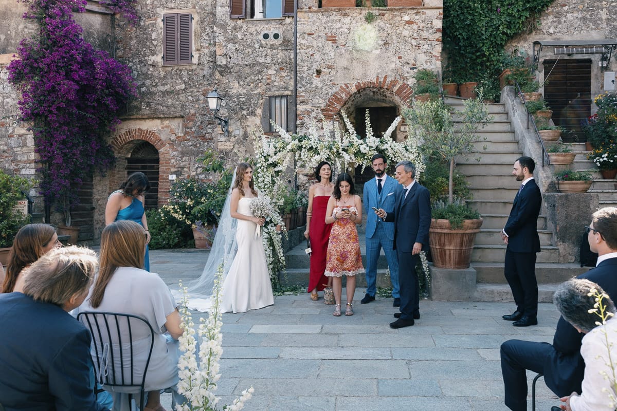 Capalbio, with its narrow stone alleys and sun-soaked walls, was more than a setting. It was part of the story. Olivia has roots there, and the connection to the place was woven into every detail. Their medieval town wedding in Tuscany felt like a return—intimate, grounded, and deeply personal.