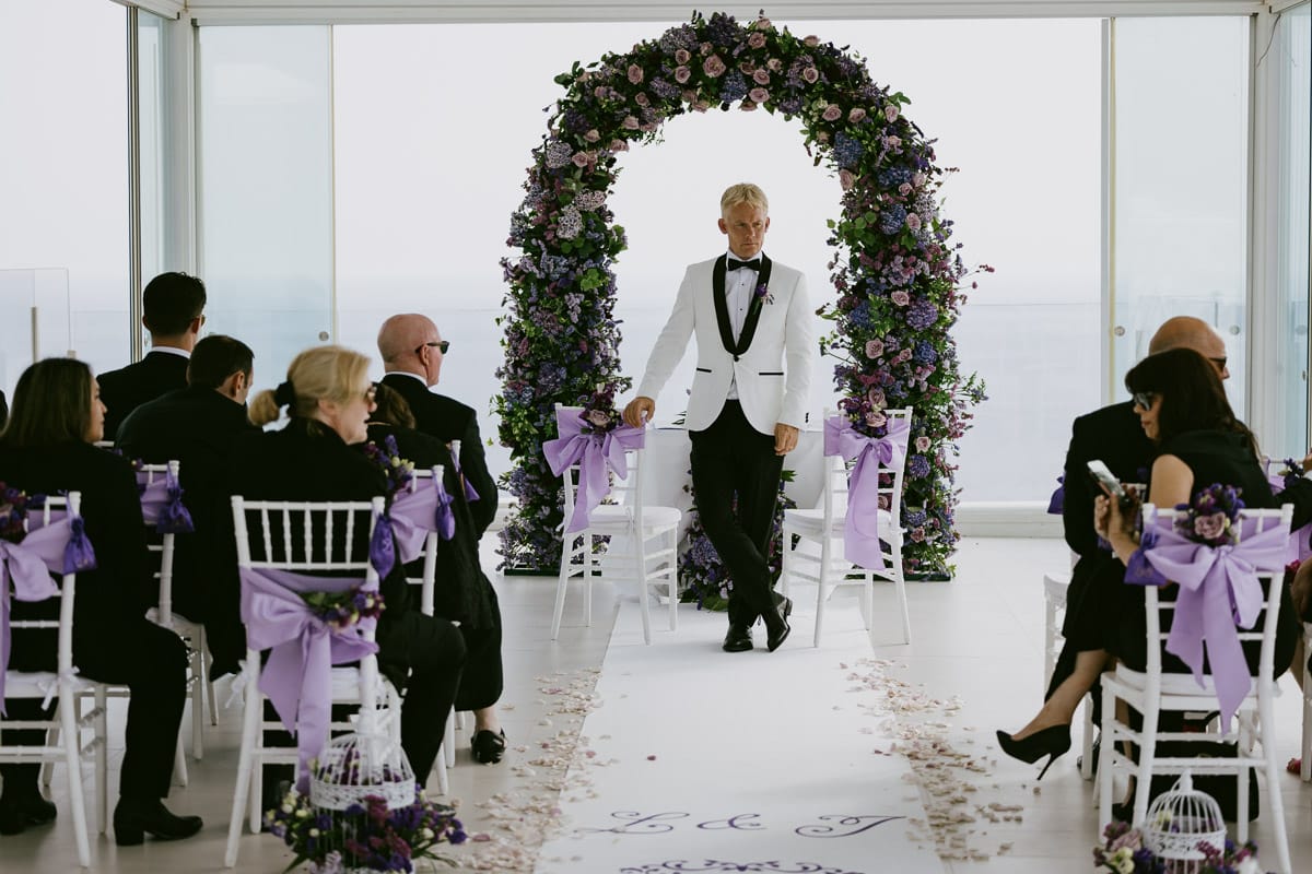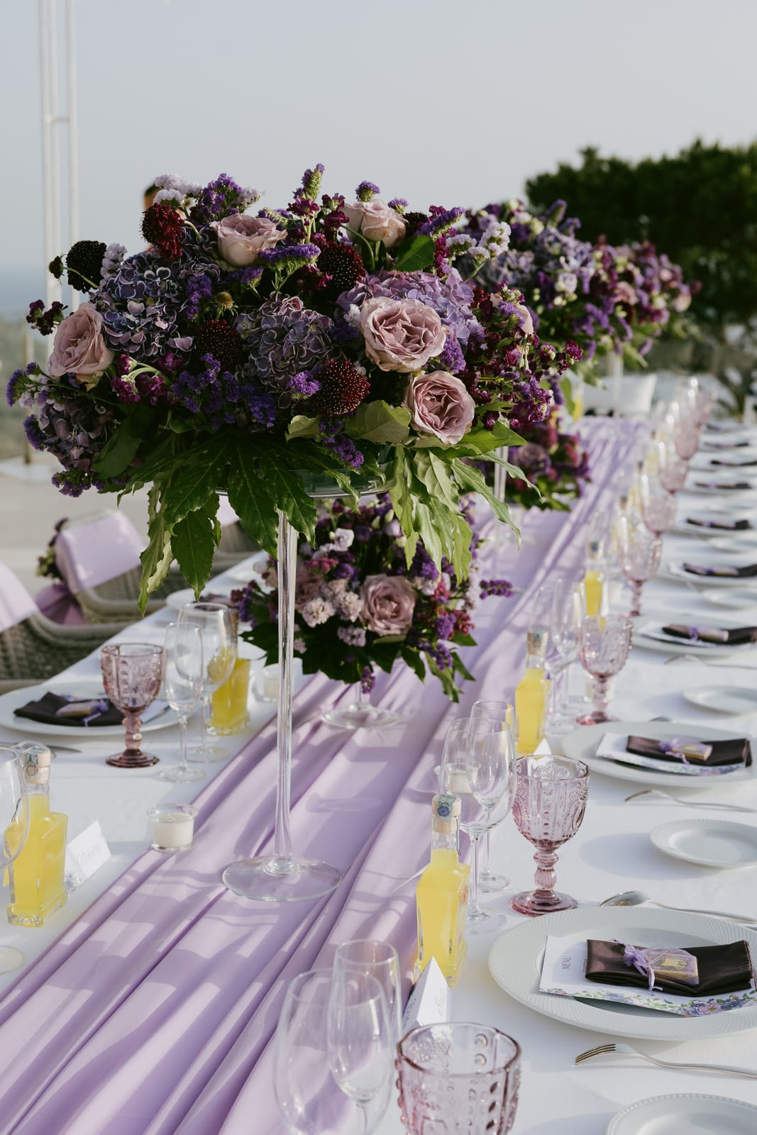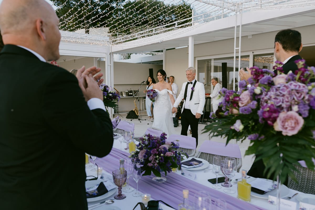 Afterward, guests gathered for aperitivo on the terrace—sipping cocktails and enjoying fresh canapés while taking in the sweeping views. As golden hour settled over the coast, dinner was served under the stars. The couple curated a beautiful fusion menu that brought together the flavors of Italy and Ireland, adding a deeply personal touch to the evening.